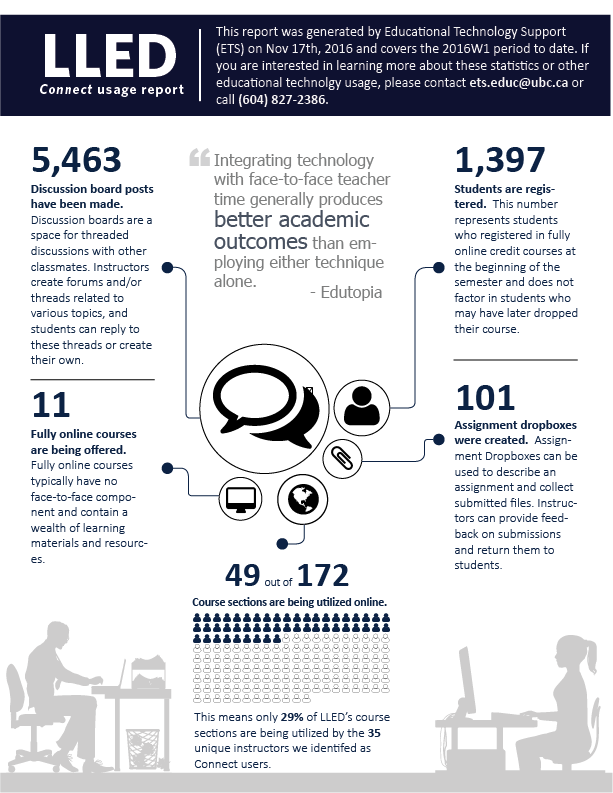 This infographic was designed for UBC's Language and Literacy Education department in the Faculty of Education. It was circulated at a staff meeting as a one-pager to show how engaged faculty were with the Learning Management System at the time.