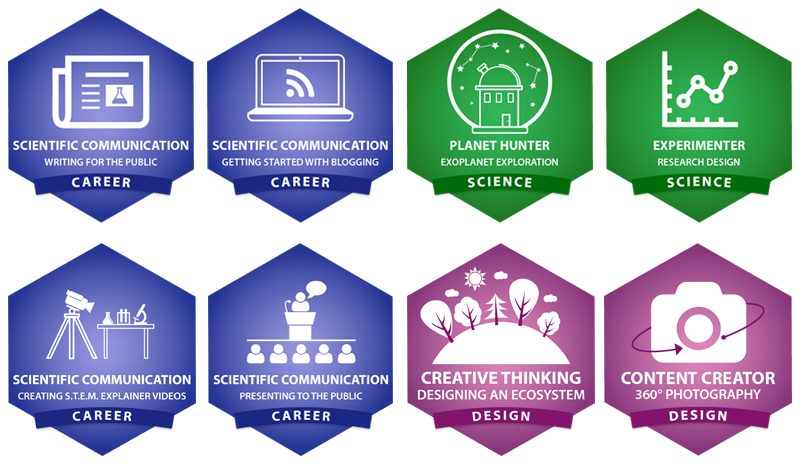 Designed for the Sky, Water, Earth project, these badges are awarded to participants to show that they have completed a learning playlist. The artwork was created in Adobe Illustrator and some FontAwesome icons were used as well as some CC0 licensed vectors from pixabay.com.