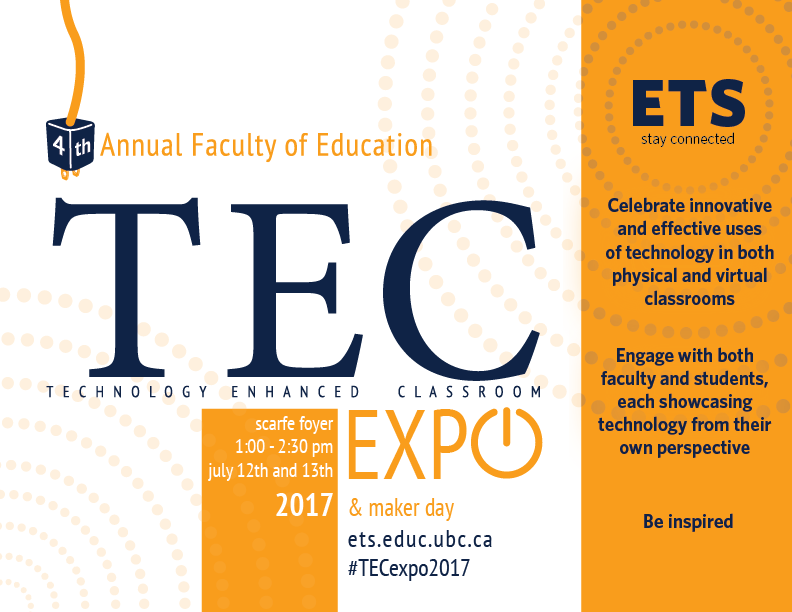 This poster is the keystone design for the TEC Expo event held by Educational Technology Support in the Faculty of Education at the University of British Columbia. This is the first poster that was conceptualized and then used to inform the design of other TEC Expo pieces. I also hosted the event in 2016 and interviewed all of the presenters while livestreaming on Facebook (to watch visit the PDCE Facebook Page).