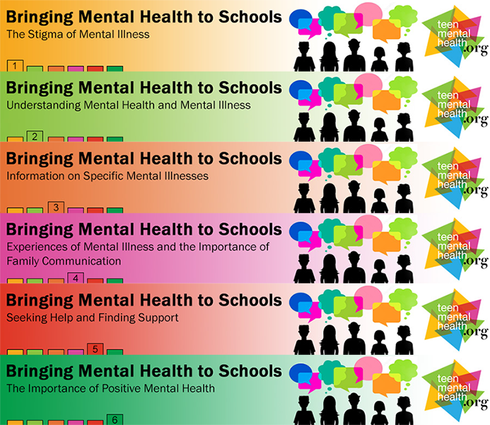 Module header images for Bringing Mental Health to Schools. Each unit banner is colour coded to materials contained within in the unit to help users easily orient themselves visually to which unit they are in.